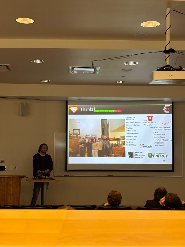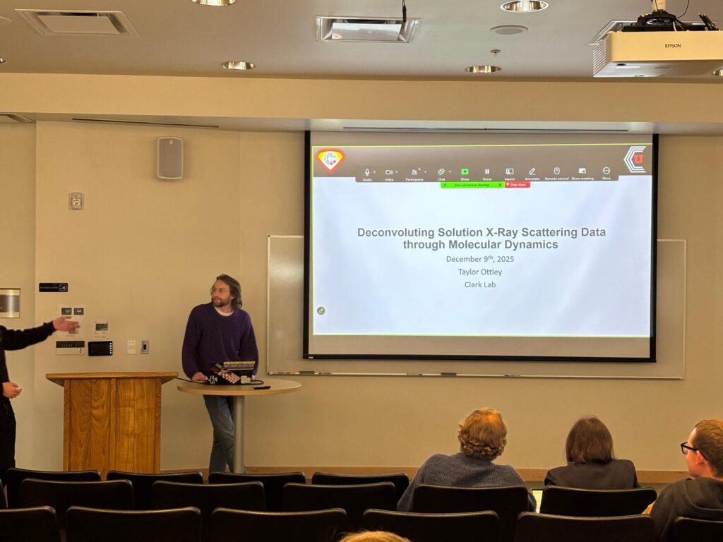 Taylor’s 2nd year seminarDecember 9, 2025Ege UyarUncategorized Taylor gave his 2nd year seminar on deconvoluting solution X-Ray scattering data through MD simulations. Congrats, Taylor, for passing this milestone in your research journey!
